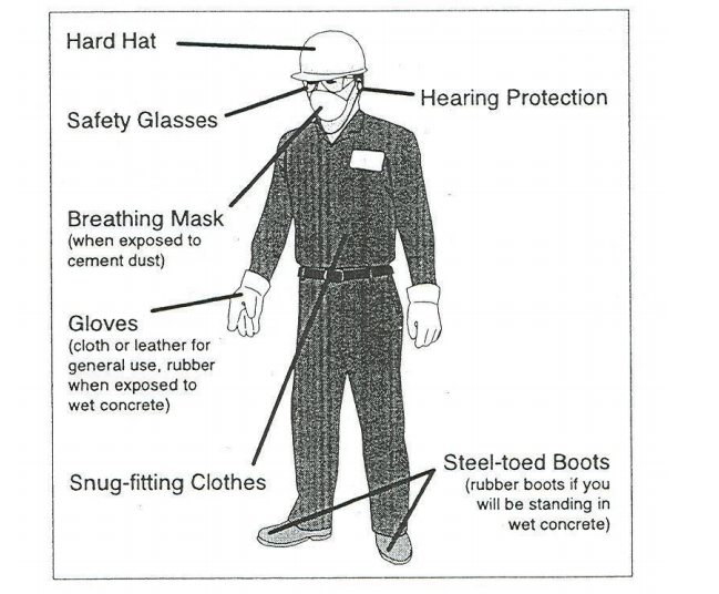 Equipo (EPI) cuando se trabaja cerca de una bomba de hormigón, camión bomba de hormigón, o un cubo grúa. equipo adecuado incluye, pero no se limita a las gafas de seguridad, Botas de punta de acero, casco de seguridad, protección para los oídos, y guantes de goma. Estos elementos son especialmente importantes cuando se trabaja cerca de la tolva o cubo. Puede haber requisitos adicionales de PPE por su empresa o en el lugar de entrega.