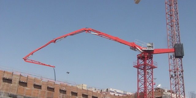Het plaatsen gieken ondersteuning 5 inch-diameter pijpleiding die opnieuw Ontvangt de afvoer van een betonpomp en plaatst het vormen Inde. Gieken hebben drie of vier scharnierende sections.The giek zijn aangebracht op een carrousel die roteert om de vrijgave