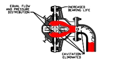 dirsek ve bir pompa içine, pompanın bir tarafına akış zorlar. Pervane diğer tarafta bir tarafta ve kavitasyon yüksek akışlarını yaşar. Bu şiddetli emme devridaim neden olabilir, Aşırı yatak aşınma, erozyon, gürültü, ses, ve artan bakım maliyeti.
