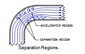 virajın dış duvarı. bir dirsek enine kesit alanı bölümden bölüme değişmeyebilir, ancak, akışı, bu bölgede geliştirilmiştir ters basınç gradyanı ile karşılaşır Ayırma dış duvarının yakınında meydana gelir. Ayrılık da bağlı advers basınç eğimleri ve keskin dönüş gereksinimlerine viraj ve orta bölümünün alt iç yakınında meydana.