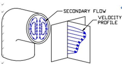 Standart bir dirseğin dış viraj yakın hızlandırılmış akış yavaş hız bölgelerle çapraz karışımı zorlanır. Elde edilen akış profili, pompa ve kontrol valfı uygulamaları için optimal.